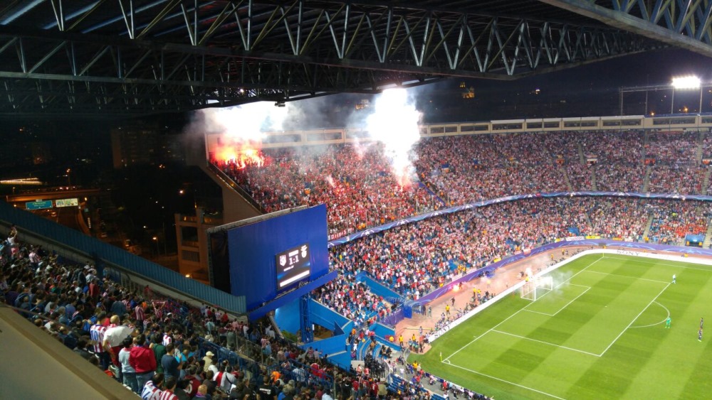 En el minuto 36 del partido los aficionados del Benfica ubicados en el primer y segundo anfiteatros del fondo norte del Vicente Calderón encendieron y lanzaron al menos cinco bengalas hacia abajo, a la grada con seguidores del Atlético y al césped, en el momento en el que el argentino Nico Gaitán marcó el 1-1 para el conjunto portugués.