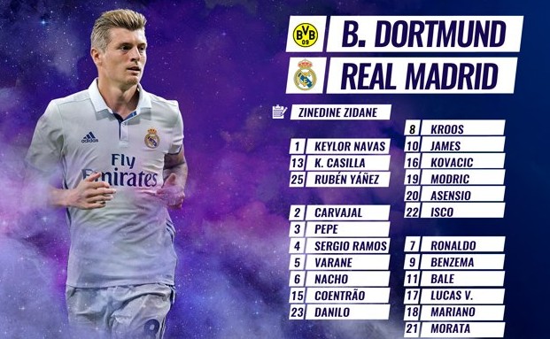 La lista de convocados la integran: Keylor Navas, Casilla, Yáñez, Danilo, Carvajal, Pepe, Sergio Ramos, Varane, Nacho, Coentrao, Kroos, Kovacic, Modric, Isco, James, Marco Asensio, Lucas Vázquez, Bale, Cristiano Ronaldo, Mariano, Benzema, y Morata.