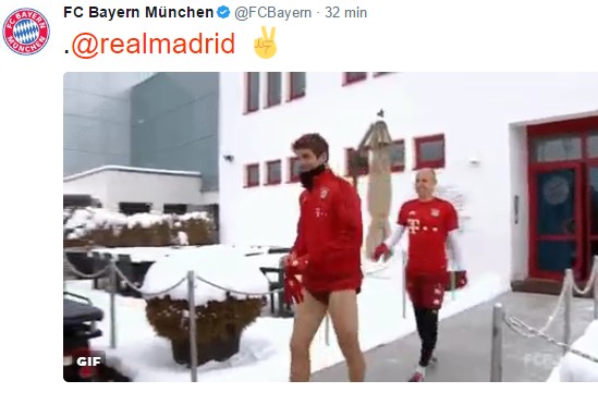 La cuenta de Twitter del Real Madrid ha publicado una imagen del Santiago Bernabéu nevado que ha llamado la atención de su homónima en el Bayer de Múnich.