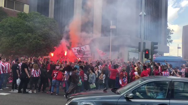 Seguidores del Atlético ya calientan el derbi en Plaza de Castilla