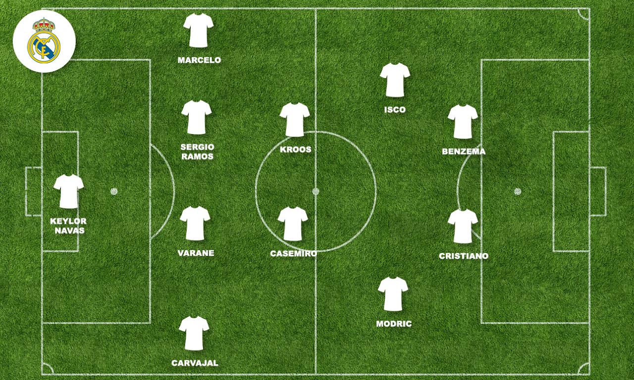 El once del Real Madrid en la gran final de la Champions estará formado por Keylor Navas, Carvajal, Sergio Ramos, Varane, Marcelo, Casemiro, Kroos, Modric, Isco, Cristiano Ronaldo y Benzema.