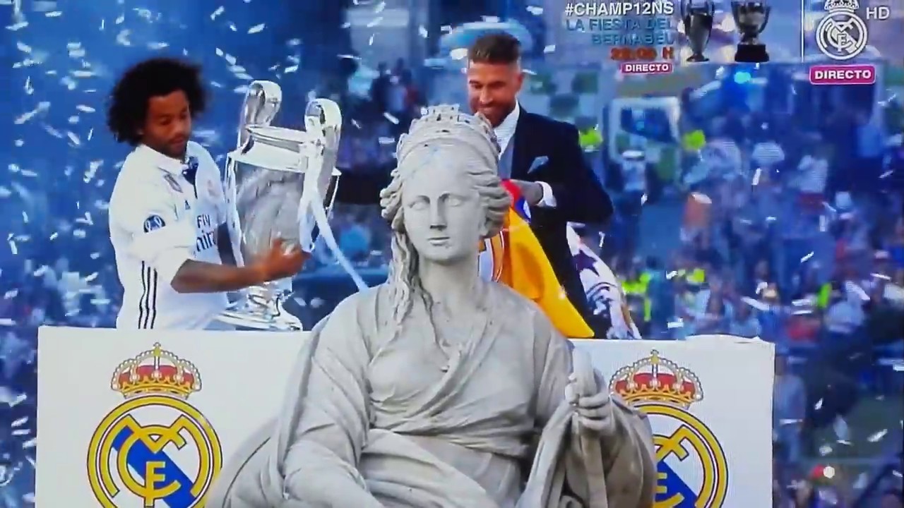 Vídeo para el recuerdo. Ramos y Marcelo ofrecen la Duodécima a la afición, adornan la Cibeles con una bandera de España y una bufanda del Real Madrid y besan a la diosa.