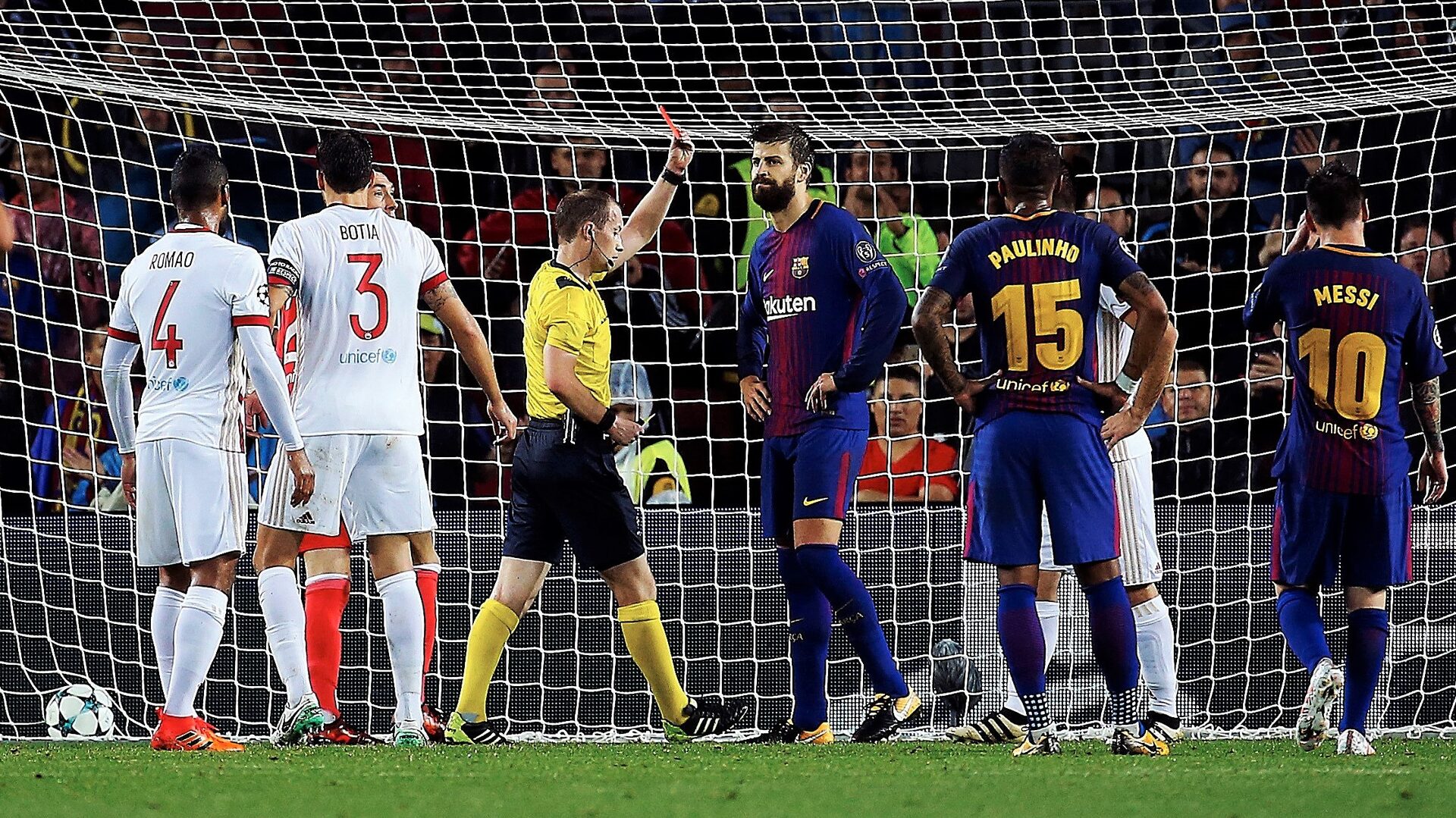 Piqué, que vio una amarilla en el 11 por atajar en la banda un intento de contragolpe, acabó expulsado en el último tramo de la primera parte cuando marcó con el brazo derecho, en una acción que vio el juez de la línea de gol, ya que el árbitro no percibió la infracción. Ésta ha sido la tercera amarilla que ha visto esta temporada el central catalán por tocar el balón con la mano.