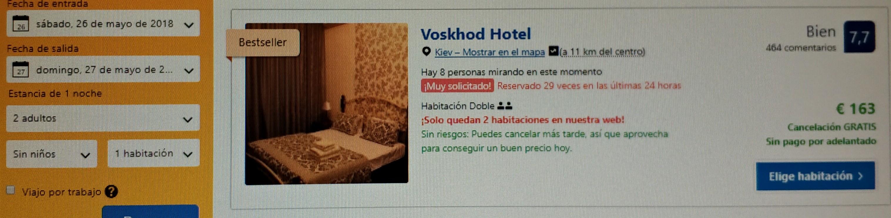Si aún no tiene alojamiento y tiene programado viajar a Kiev, no dude en aprovechar esta ganga: Voskhod Hotel. Es cierto, está a 11 kilómetros del centro, pero sale la noche del sábado al domingo por 163 euros. Viendo cómo está el panorama, igual compensa tirar de taxi, ¿no? Desde luego el precio a día de hoy es un milagro caído del cielo.