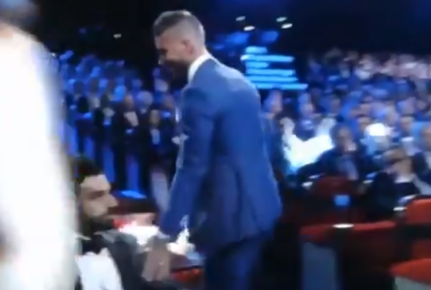 En el sorteo de la fase de grupos de la Champions, tras recoger Ramos el premio a mejor defensa de la pasada temporada para la UEFA, el de Camas le da un pequeño toque a Salah en el hombro. Consciente o inconscientemente, Ramos logra que el jugador del Liverpool ni se inmute y se le quede cara de póker.
