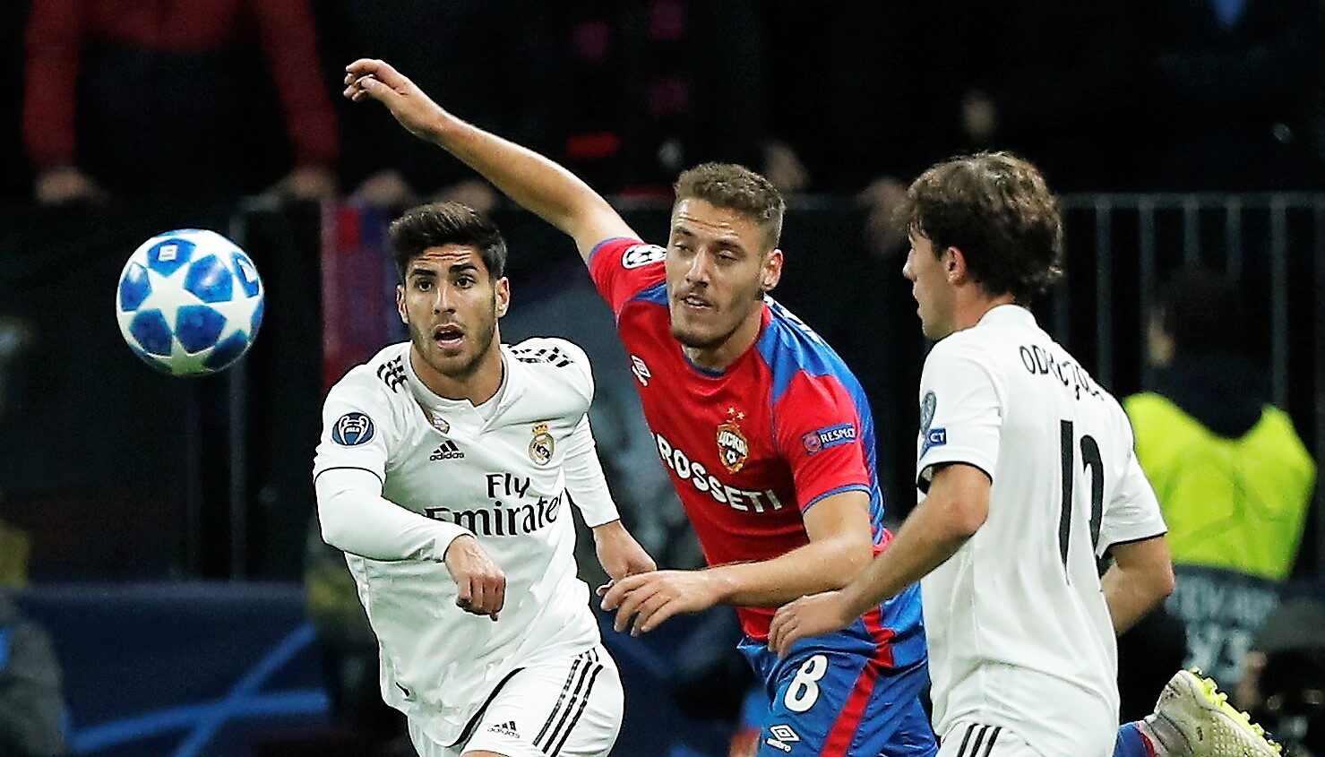 Acudía el Madrid a Moscú con varias bajas importantes, como las de Sergio Ramos y Bale que se sumaban a las ya conocidas de Marcelo e Isco. Fue turno para la segunda unidad, con los Keylor Navas, Nacho y Ceballos en el once junto a Reguilón y Lucas Vázquez, que se estrenaban como titulares esta temporada. En el banquillo, un Luka Modric a quien Lopetegui dio descanso. El campeón se vio sorprendido en el inicio: un horroroso pase hacia atrás de Kroos lo aprovechó a la perfección Vlasic para marcharse de Varane —pudo hacer más el francés, que estuvo blandito—, presentarse en el área y batir a Keylor. Sólo se llevaba un minuto de partido y ya tocaba remar contra corriente.