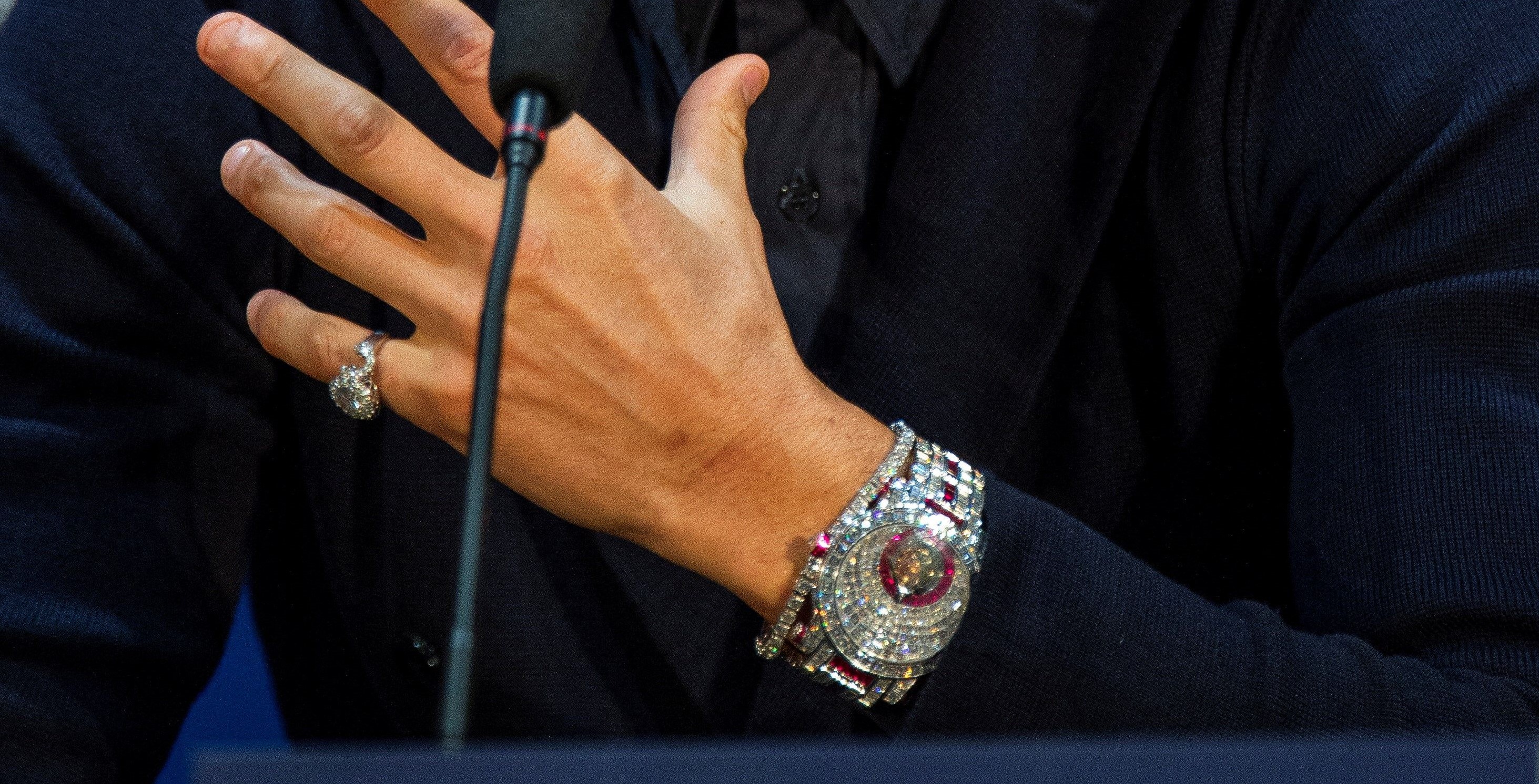Según informa el diario The Sun, el reloj que portaba en su muñeca izquierda está valorado en más de un millón de euros. No es algo casual, ya que la marca es Jacob & Co y el portugués es imagen de la misma desde hace cinco temporadas. Lleva incrustados más de 420 brillantes y es de una exclusiva gama de la marca.