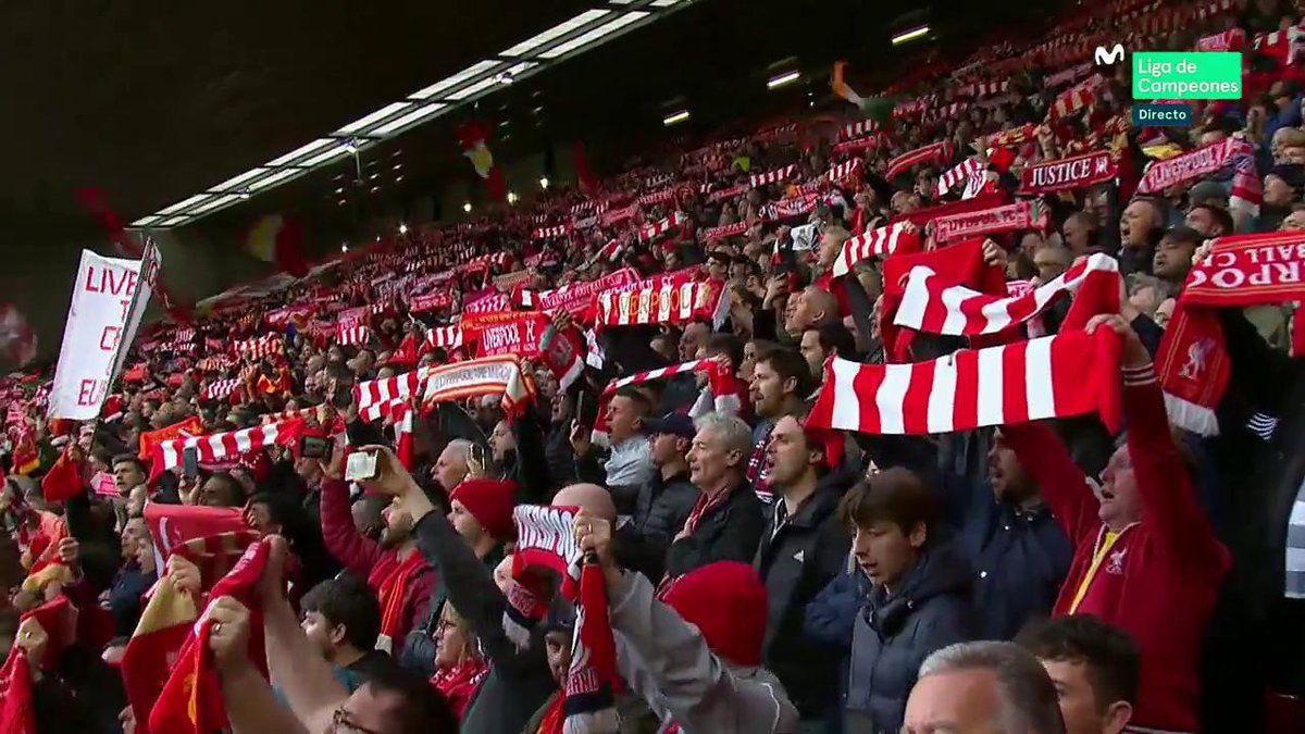 La manera de cantar el "You’ll never walk alone" antes de comenzar el partido pone los pelos de punta. Esto es Anfield, amigos.