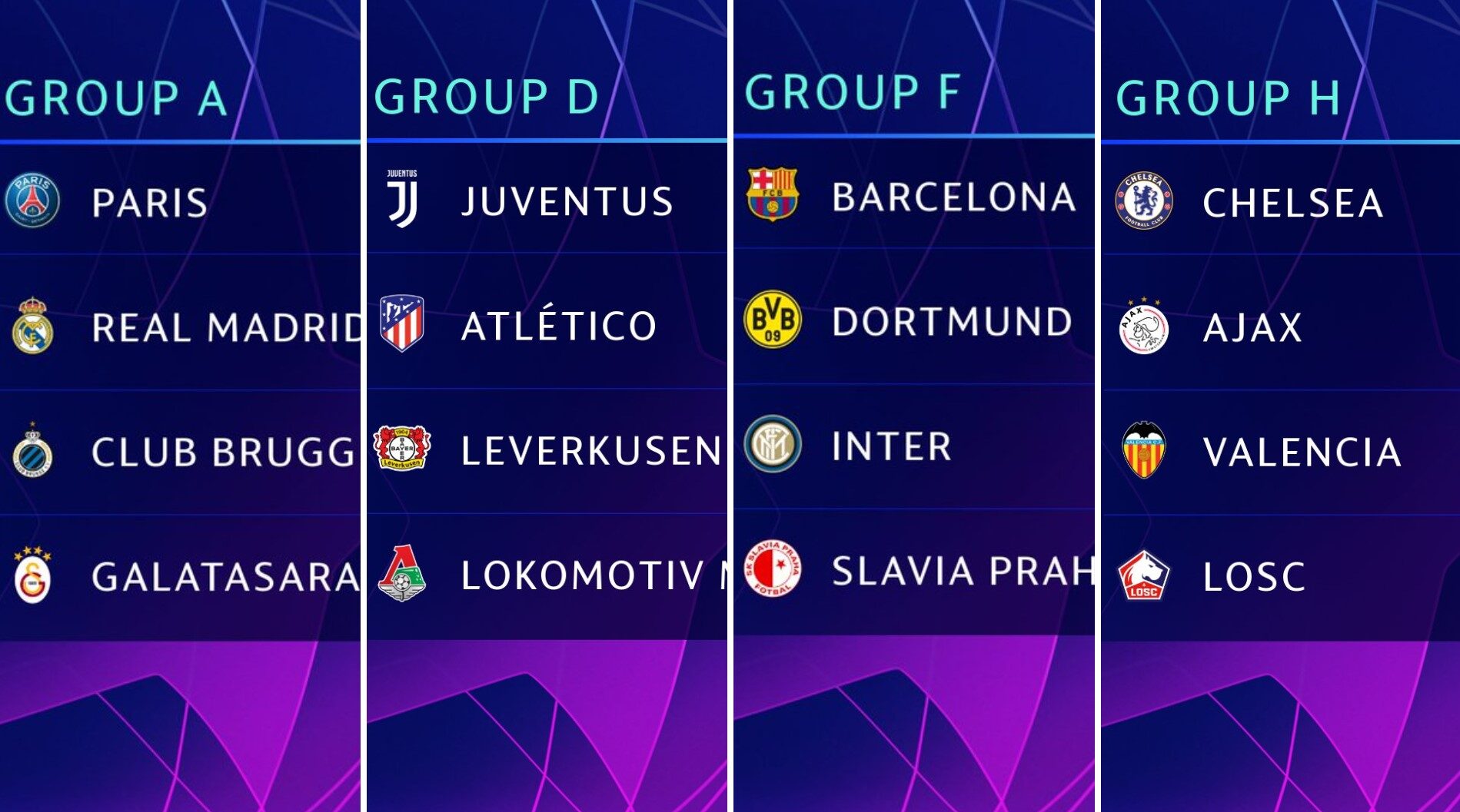 El Tottenham de Mauricio Pochettino, finalista el pasado mes de junio en el Wanda Metropolitano, tendrá un potente cruce en el grupo B contra el Bayern de Múnich y dos rivales que vienen de la previa, Olympicacos y Estrella Roja, mientras que el Manchester City de Pep Guardiola se jugará el pase en el grupo C con el Shaktar Donetsk ucraniano, el Dinamo de Zagreb y el Atalanta.