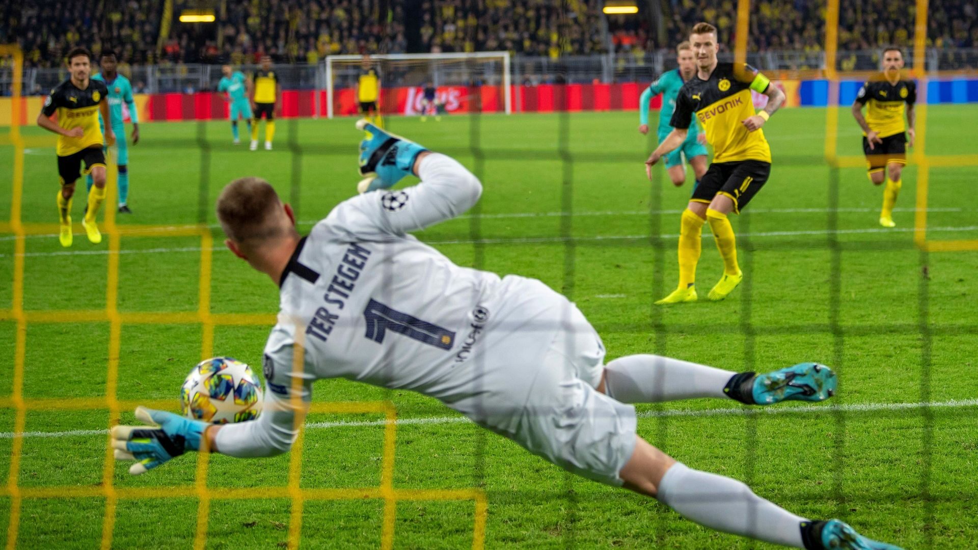 La imponente actuación de Marc André Ter Stegen, que paró un penalti a Marco Reus en el minuto 56 y realizó cuatro intervenciones de mérito, permitió al Barcelona sumar un punto en Dortmund (0-0), donde el Borussia mereció la victoria en el retorno de Leo Messi. Sin Ter Stegen seguramente el Barça habría perdido. Fue el salvador de un equipo con un fútbol plano, que fue de más a menos y que, paradójicamente, tuvo una ocasión en el minuto 93 para llevarse el partido. Pero es que al equipo de Ernesto Valverde le fallan los automatismos. Su fútbol no está afinado, sufre demasiado y solo se defiende con el balón, pero no intimida.