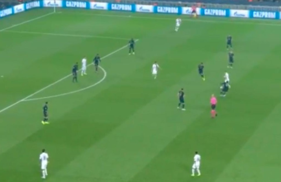 El sistema defensivo del Madrid fue muy deficiente. En estático, la distancia entre líneas y la presión deslavazada, hizo que el PSG encontrara con suma facilidad líneas de pase para asociarse en tres cuartos. Como vemos en la imagen, la distancia entre la línea defensiva y el centro del campo generaba un enorme hueco por el que campaban a sus anchas los Sarabia, Verratti, Di María o Icardi. La pareja de centrales, Varane y Militao, se quedaban anclados en la línea del área en numerosas ocasiones. Sin salir de la cueva, provocaban que el equipo se hiciera demasiado largo.