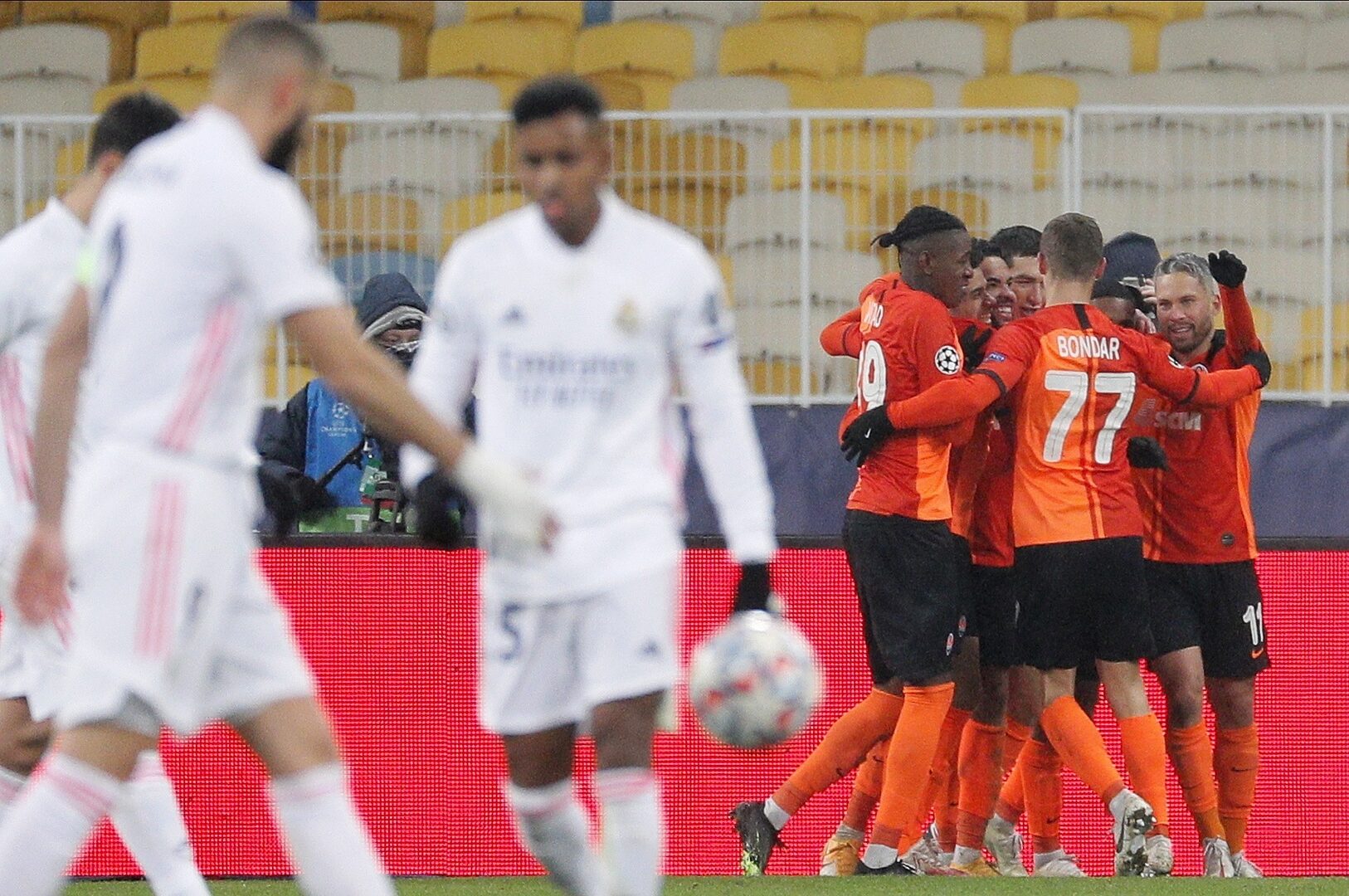 El Madrid dominaba en un inicio con muy buena pinta y el único lunar fue un error en una entrega de Nacho que casi le cuesta la expulsión a Varane. El francés derribó a Junior Moraes, que acabaría siendo sustituido por Dentinho minutos después, y el partido estuvo parado cuatro minutos, lo que añadido a la baja temperatura en la capital ucraniana —llegó a nevar en los últimos minutos de la primera parte— hizo que el encuentro se enfriara.