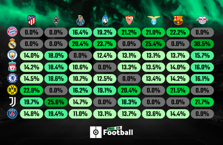 El rival más probable para el Barcelona sería el Bayern de Múnich (22,2 por ciento), por delante de Dortmund (21,5), PSG (14,4), Chelsea (14,2), Liverpool (14) y Manchester City (13,7), mientras que los rivales más probables del Sevilla son el Bayern (21,2), Dortmund (20,4), Juventus (18,3), PSG (13,7), Liverpool (13,3) y Manchester City (13,1), por ese orden.