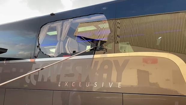 El conjunto blanco llegó al estadio del Liverpool una hora y media antes del encuentro y su recibimiento acabó con varias pedradas. Una de ellas impactó en uno de las ventanas laterales del vehículo, el cual tuvo que ser reparado en su llegada al recinto deportivo.