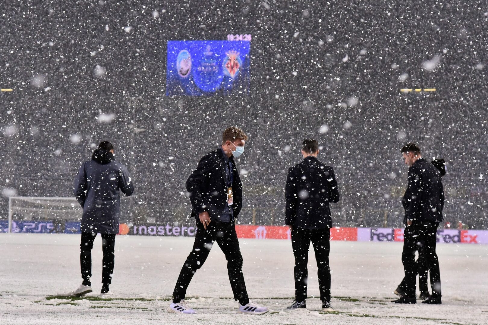 La UEFA decidió aplazar el duelo pasadas las 21 horas, el horario previsto para su comienzo, debido a la nieve que dejó impracticable el terreno de juego en el Gewiss Stadium. El árbitro del encuentro, el inglés Antony Taylor, no dudó en postergar el duelo.