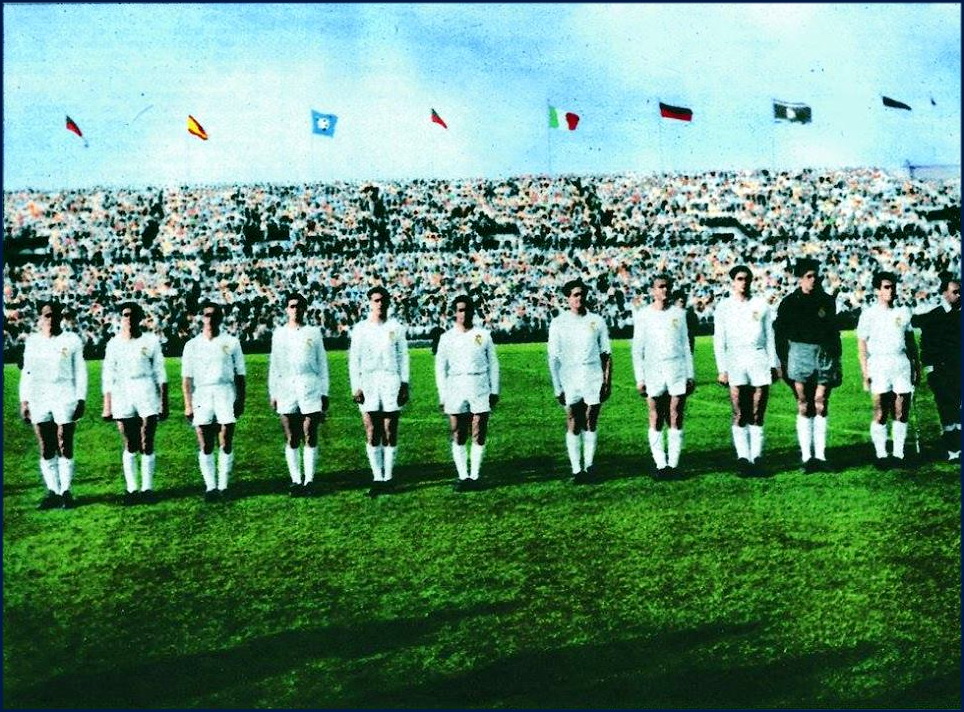 El Real Madrid fue el primer campeón de la Copa de Europa. Tras eliminar a Servette, Partizán y Milan, el conjunto entonces dirigido por José Villalonga derrotó en la final, disputada en el Parque de los Príncipes de París, al Stade de Reims francés por 4-3. Marquitos y Héctor Rial fueron los artífices de la remontada blanca.