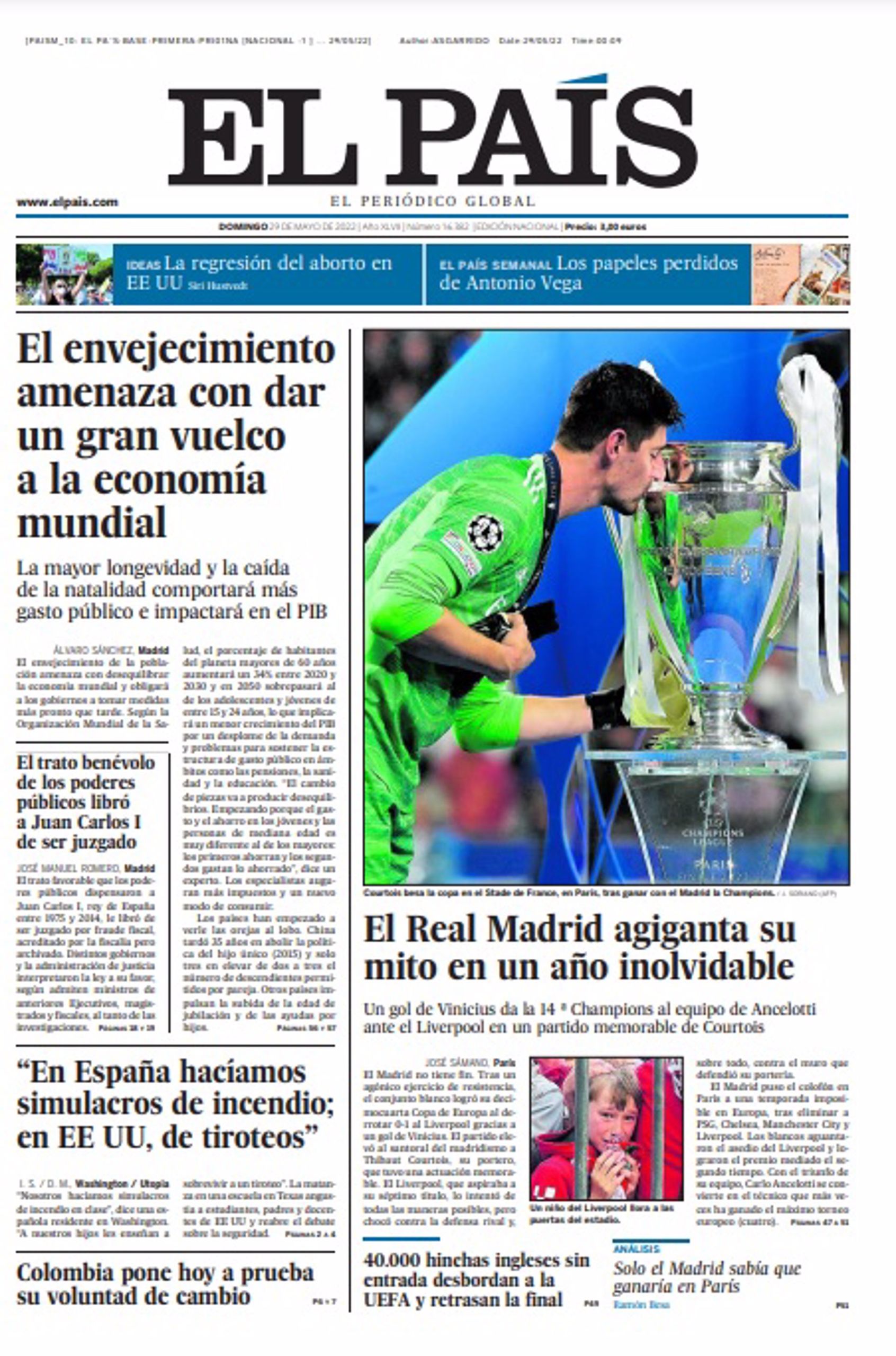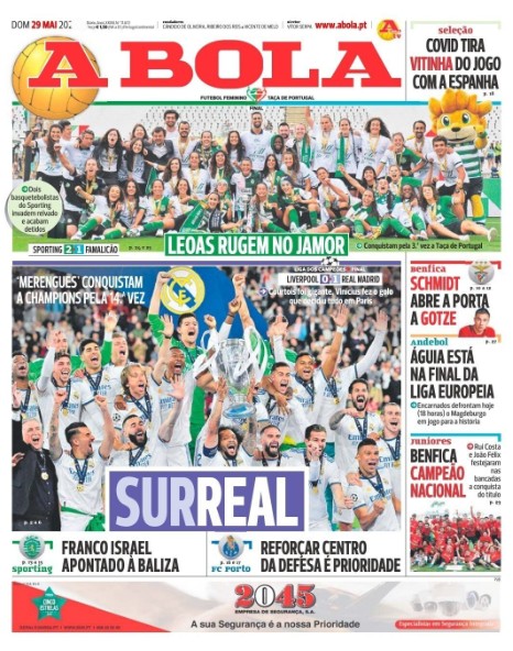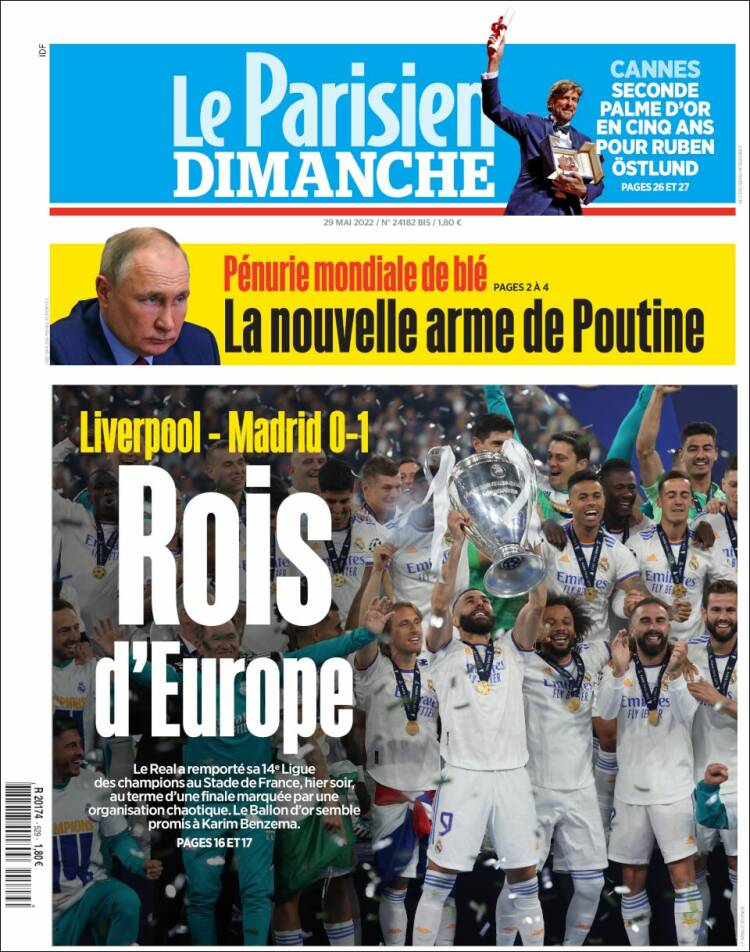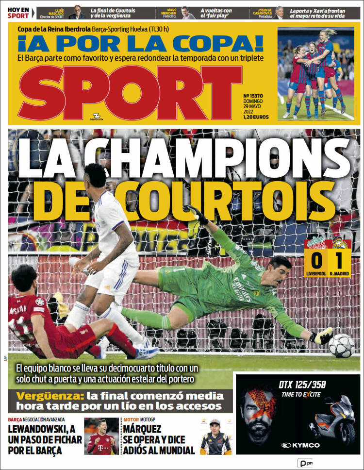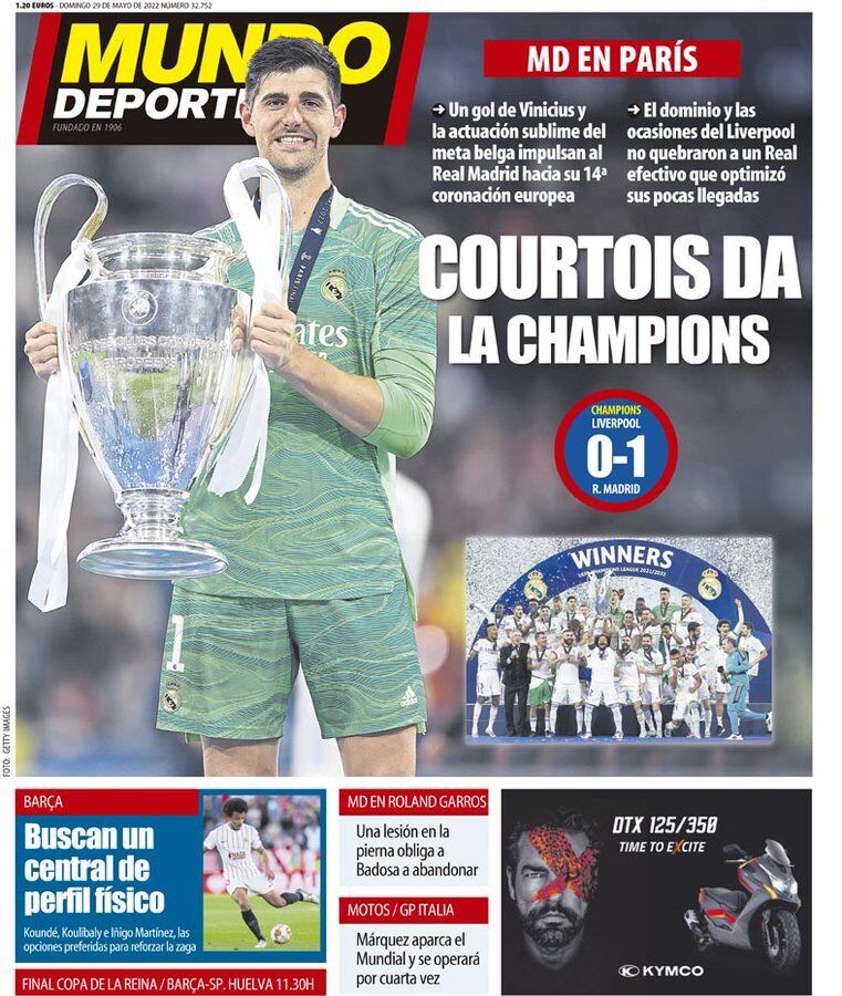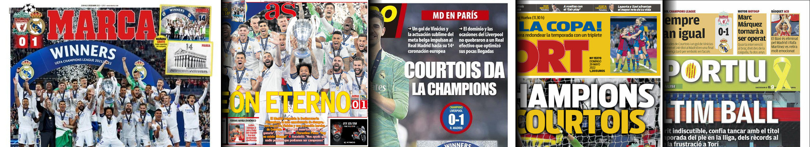 Casi todos los periódicos, deportivos y no deportivos, dedican este domingo 29 de mayo sus portadas a la victoria del Real Madrid en la final de la Champions en París.