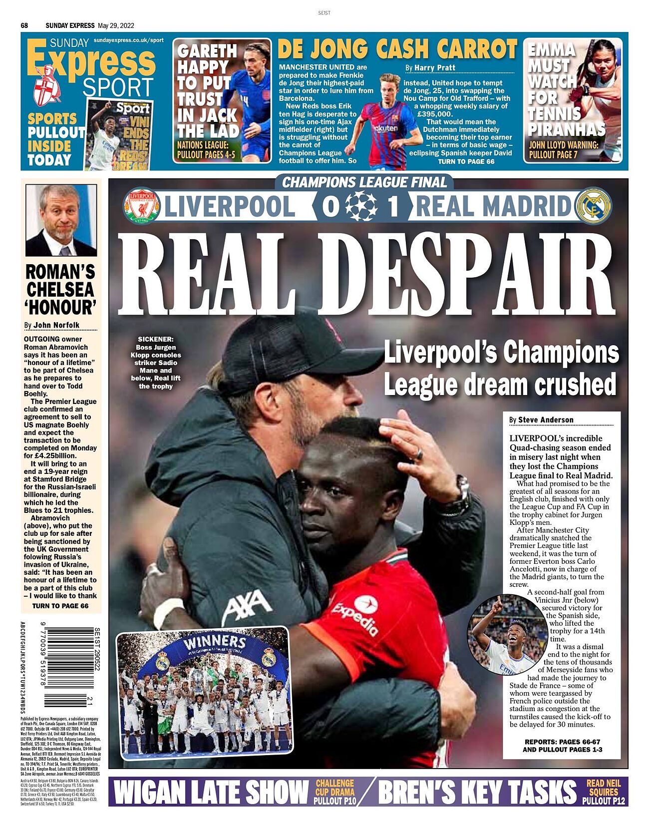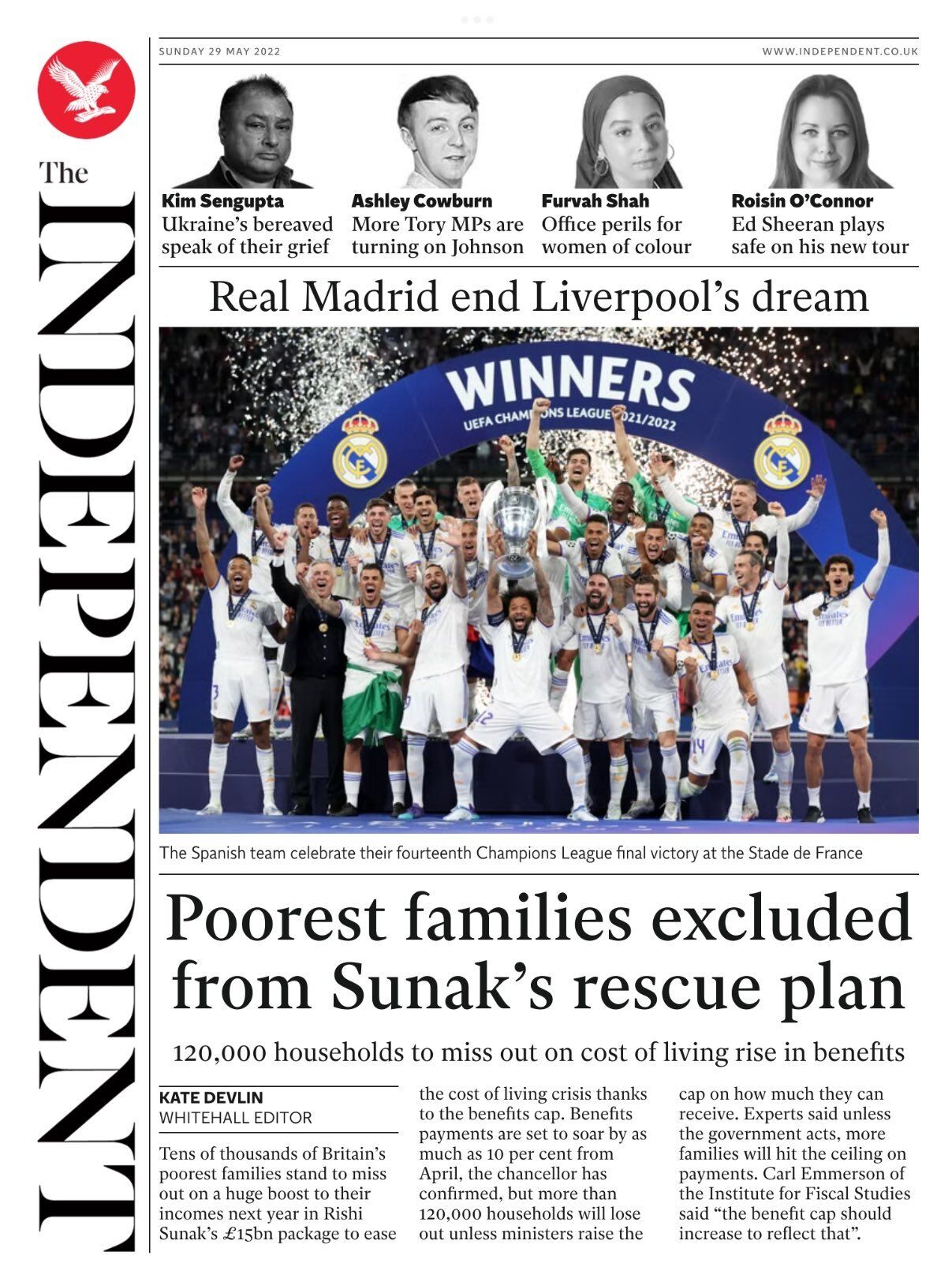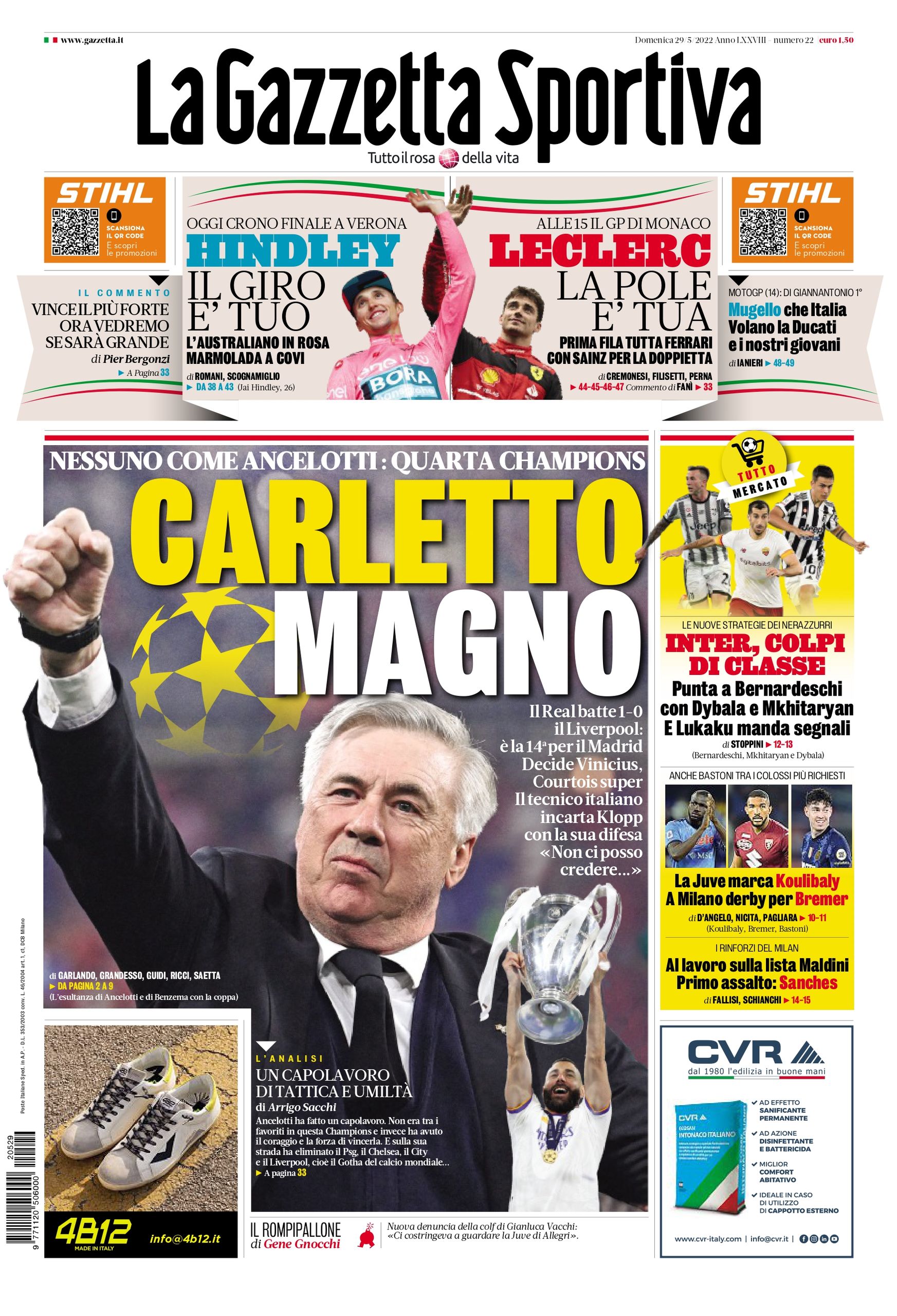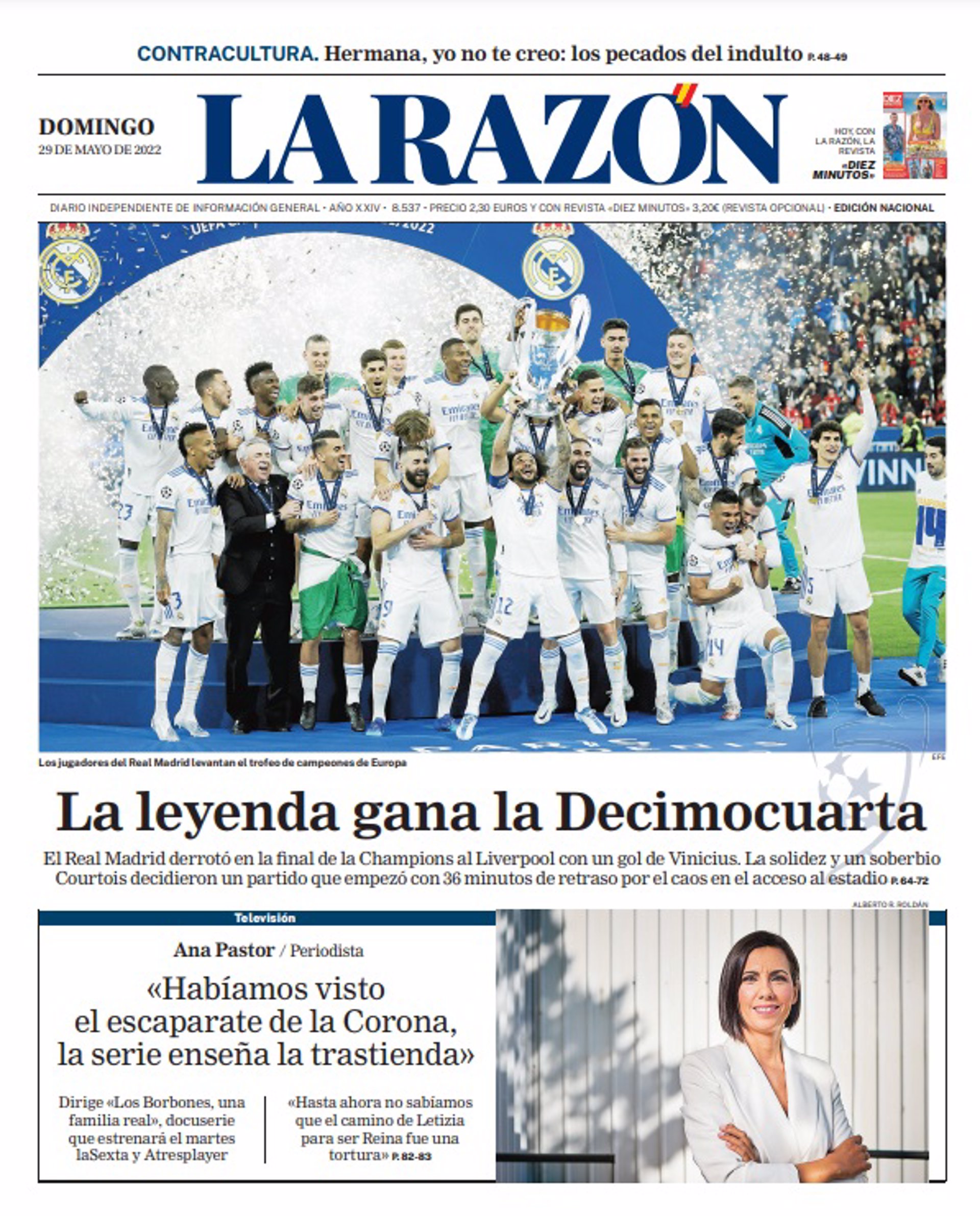 Casi todos los periódicos, deportivos y no deportivos, dedican este domingo 29 de mayo sus portadas a la victoria del Real Madrid en la final de la Champions en París.