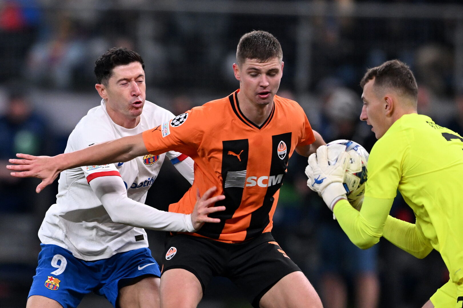 El equipo local fue el primero en tener una buena opción con una clara ocasión de su lateral izquierdo, Matviyenko, que no acertó a colocar su disparo ante Ter Stegen, que lo repelió prácticamente sin inmutarse. Un disparo alto de Gündogan fue lo mejor de los visitantes, pocos entonados en los metros finales, con Lewandowski pasando de nuevo desapercibido y Ferran Torres y Raphinha sin aportar demasiado. Pese a su ineficacia atacante, el Barça tenía el partido bastante controlado cuando fue sorprendido por el Shakthar. Sudakov metió un gran cambio de juego a la entrada de Gocholeishvili y el lateral georgiano envió un buen centro al área donde Sikan se elevó para cabecear con suavidad y colocado para superar a Ter Stegen y dar ventaja a los suyos justo antes del descanso.