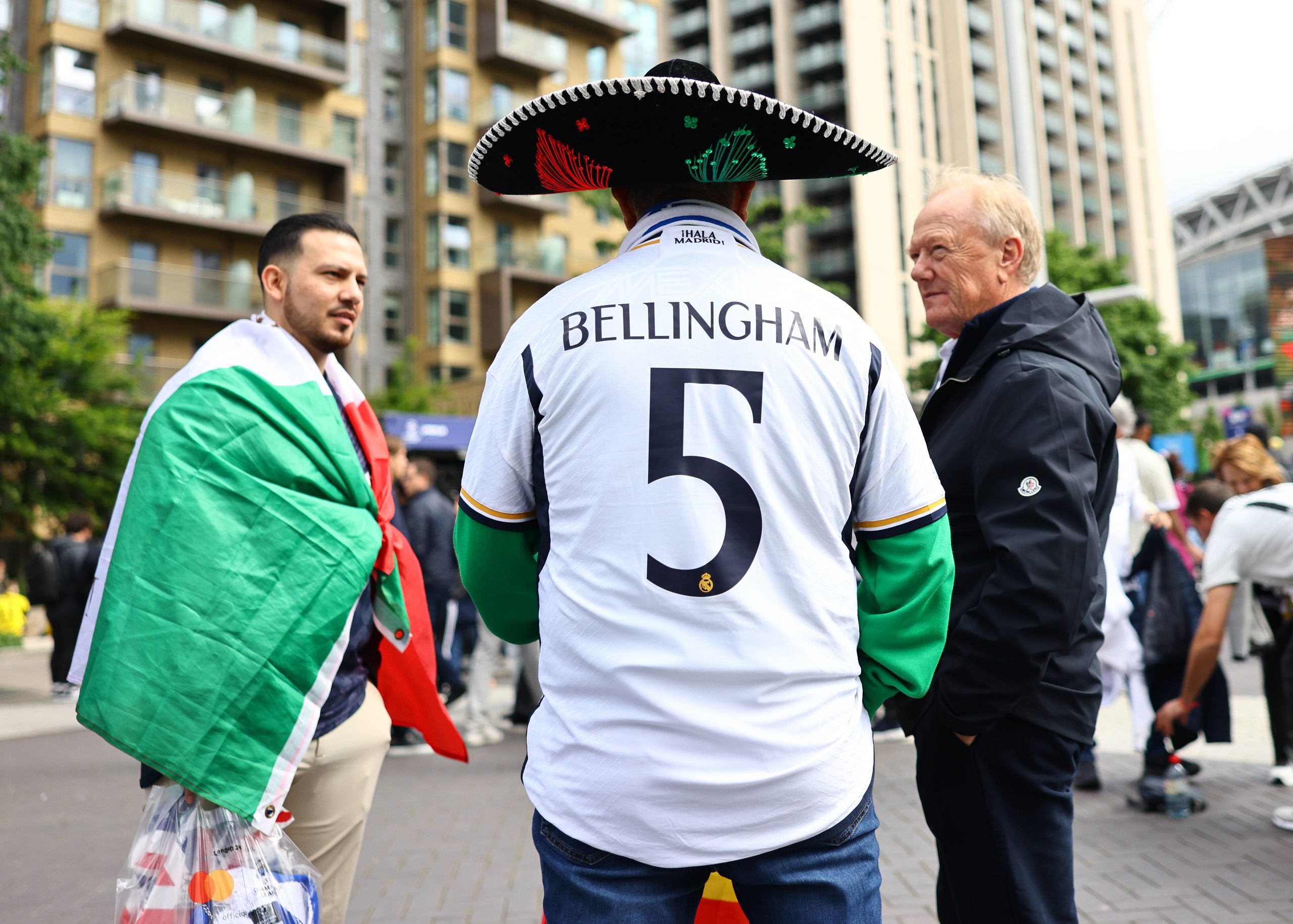 Un aficionado madridista, con un sombrero mexicano y la camiseta de Jude Bellingham.