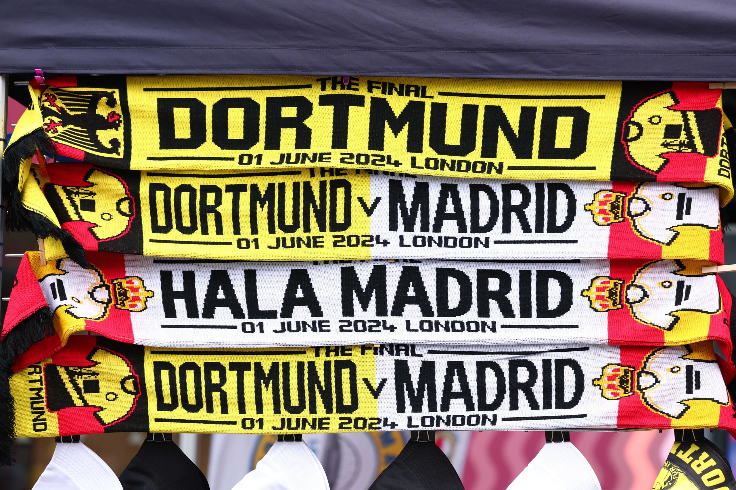 Bufandas conmemorativas de este histórico partido: Borussia Dortmund-Real Madrid, correspondiente a la final de la Liga de Campeones 2023/24.
