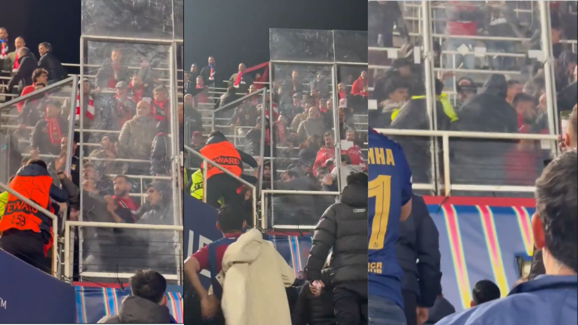 Gracias a un vídeo grabado por un usuario de X que estaba allí presente, hemos podido ver la forma de actuar de la parte más radical de los aficionados del Benfica. A base de patadas, empujones y puñetazos, la facción más radical de estos seguidores intentaba tirar abajo el cristal de la pared que separaba a una afición de otra.