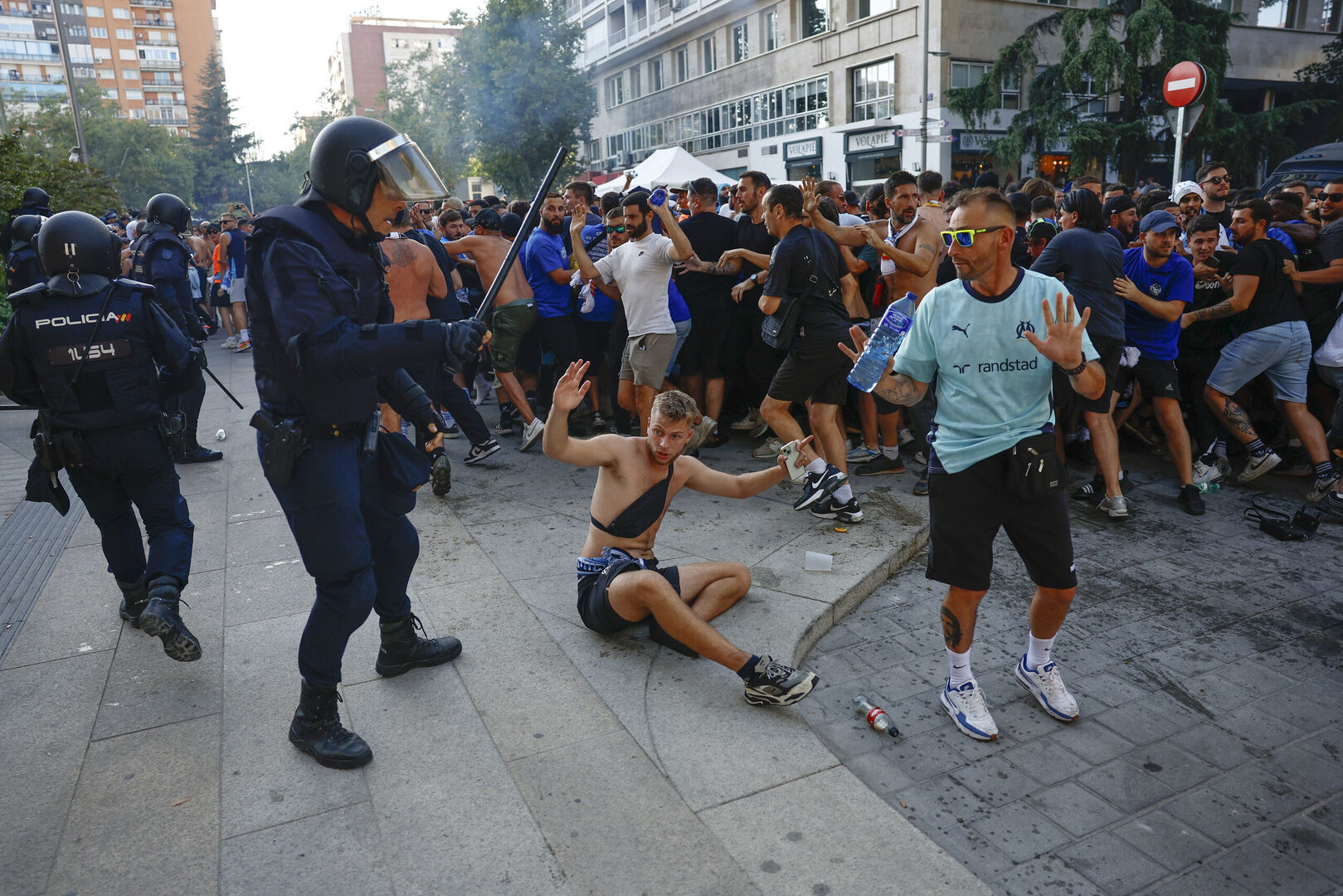 🚨 Disturbios entre la POLICÍA ESPAÑOLA y los ULTRAS del MARSELLA en las afueras del SANTIAGO BERNABÉU.pic.twitter.com/2S5DqZ6MhQ