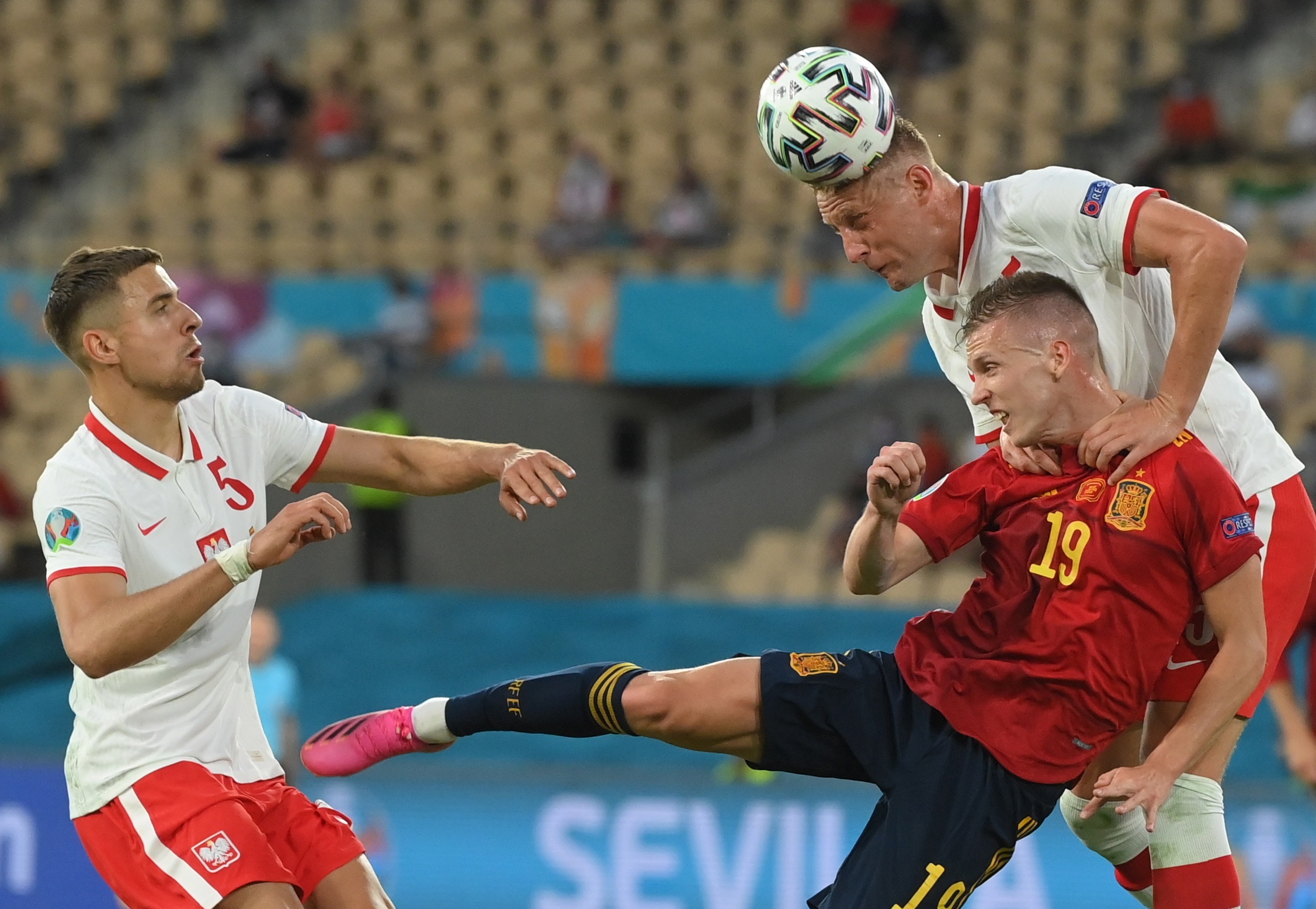 Trazaban una jugada ensayada entre Koke y Dani Olmo pero saca la pelota la defensa polaca.