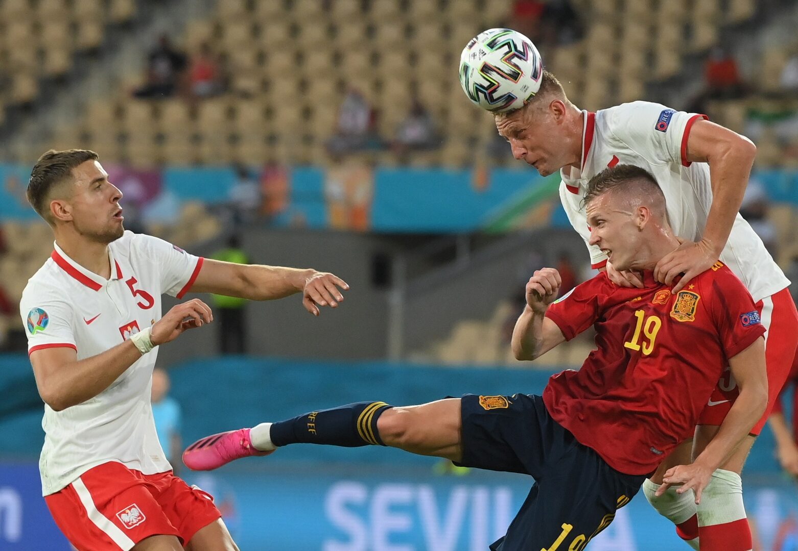 Balón colgado de Dani Olmo y Gerard Moreno fuerza el córner en la pugna con Glik. Balón parado para España.
