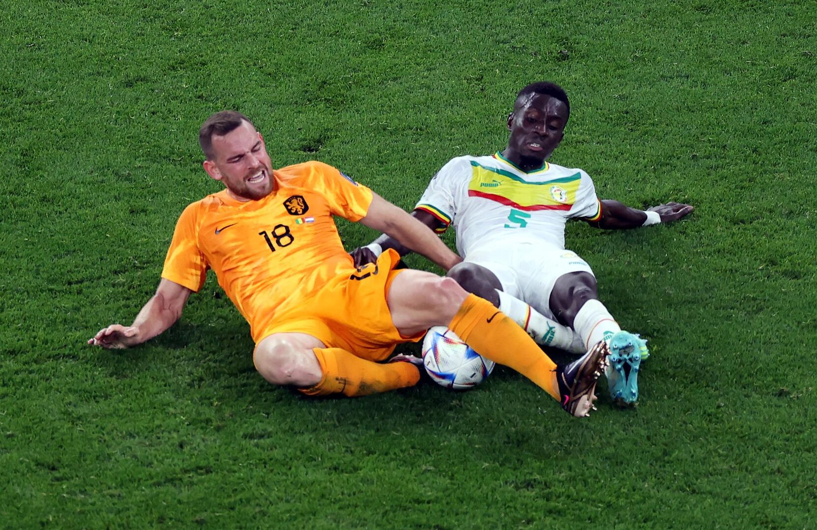 No acaba de conseguir profundidad Senegal por las bandas. Apenas suben los laterales y eso facilita la tarea defensiva de Holanda.