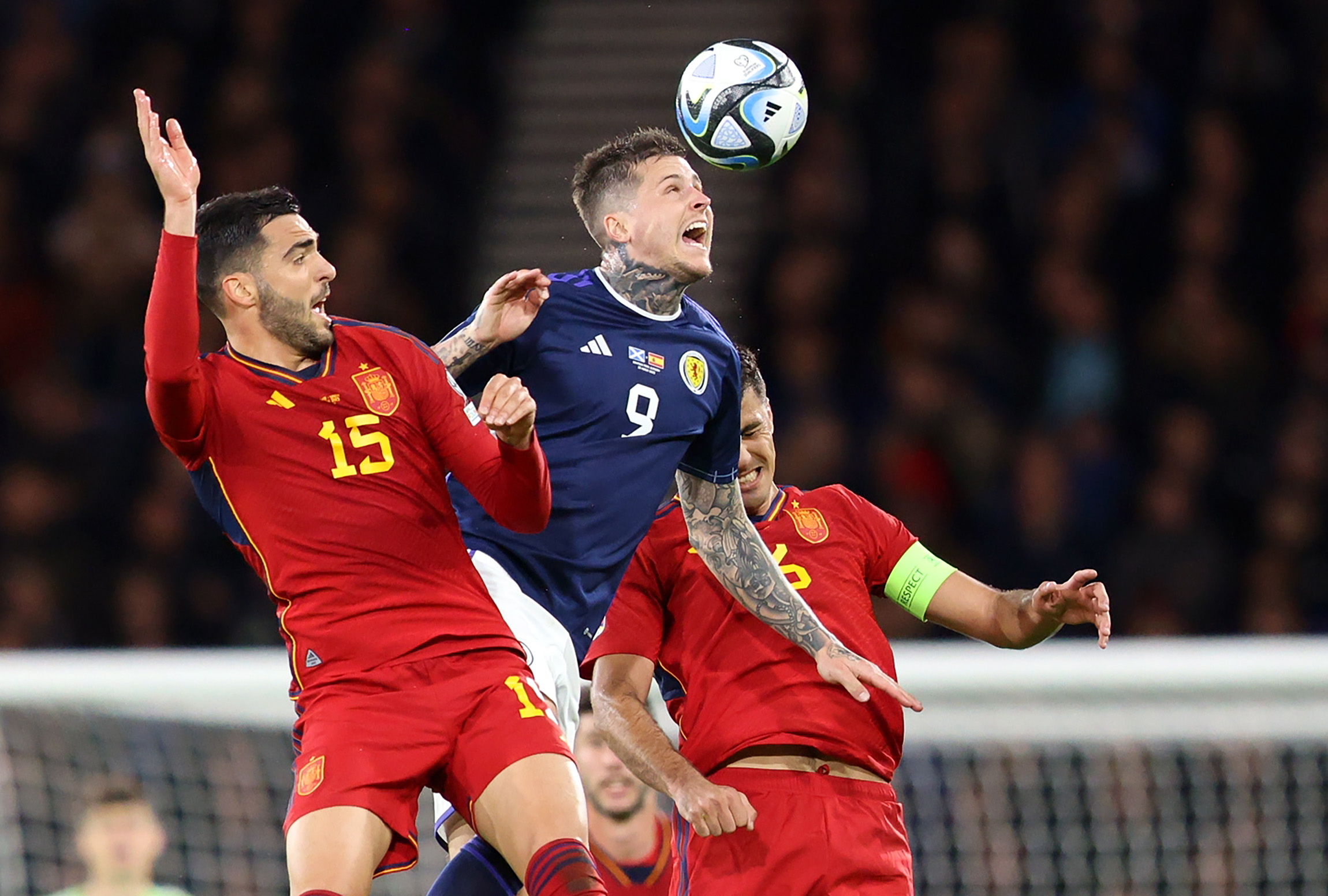 Se adelantó muy pronto Escocia con el gol de McTominay, tras un inoportuno resbalón de Pedro Porro, pero España reaccionó y tuvo buenas ocasiones para haber empatado, entre ellas un testarazo de Joselu que se estrelló en el larguero. Pudo llegar el empate pero también el 2-0, justo antes del intermedio, con una clarísima ocasión de Dykes en el mano a mano con Kepa.