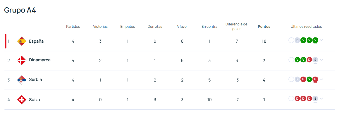 En caso de no hacerlo, y perder por un gol España tendría que replicar ante Suiza lo que Dinamarca haga ante Serbia. Si España hoy cayese por dos goles, dependería de que los daneses no ganasen ante los serbios para ser primeros de grupo.