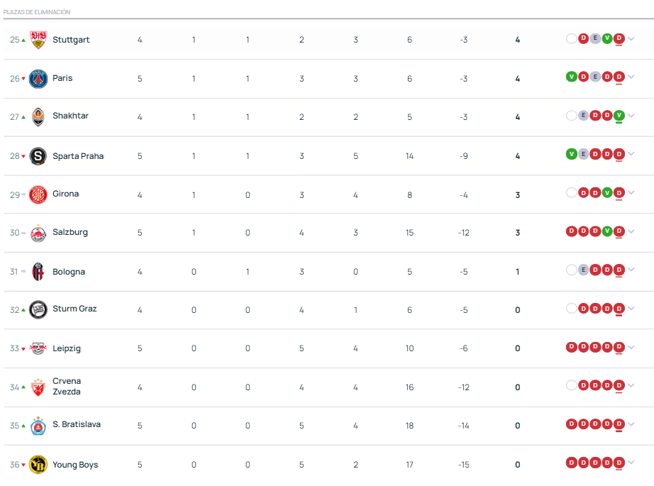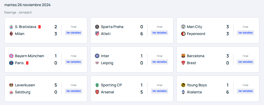 También ha habido grandes victorias como la del Leverkusen por 5 a 0 al Salzburg, el Arsenal 1 a 5al Sporting, y la Atalanta por 1 a 6 ante el Young Boys.