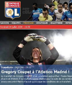 El Olympique de Lyon, vigente campeón de liga en Francia, había declarado días atrás a través de su director administrativo ser "razonablemente optimista" sobre el traspaso de Coupet al Atlético de Madrid. El club se dijo dispuesto a tratar sobre la última oferta del Atlético de Madrid (de 1,5 millones de euros) y afirmó que simplemente desea que los rojiblancos "aporten las garantías bancarias necesarias para la transferencia".