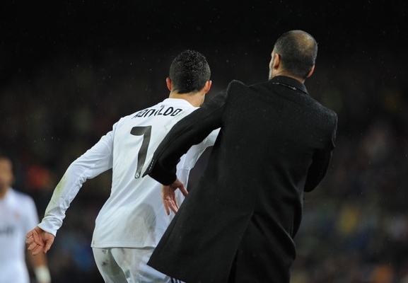 A la media hora de partido, Pep Guardiola intentó ganar unos segundos tras un saque de banda, le negó un balón a Cristiano Ronaldo y lo lanzó a su lado. Molesto por el vacile, el portugués respondió dándole un empujón al técnico del Barcelona. Víctor Valdés, que contemplaba la escena desde su portería, saltó raudo y se metió en la refriega. Al final, el árbitro Iturralde González acabó sacando tarjeta amarilla a CR7 y al guardameta local.