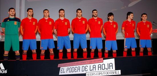 La nueva camiseta de 'La Roja', que fue presentada oficialmente en el multicine "Kinepolis" de Pozuelo (Madrid), tuvo como modelos a nueve de los integrantes de la actual selección española, entre ellos el meta Iker Casillas, capitán de la selección y que este sábado ante Argentina cumplirá 100 encuentros como internacional con la absoluta. Los otros 'modelos' fueron Albiol, Marchena, Silva, Xabi Alonso, Negredo, Güiza, Villa y Xavi Hernández.