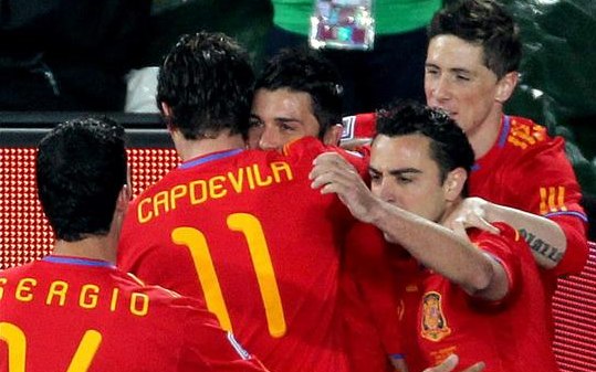 España: Casillas; Sergio Ramos, Piqué, Puyol, Capdevila; Busquets, Xabi Alonso, Xavi; Iniesta, Villa y Fernando Torres