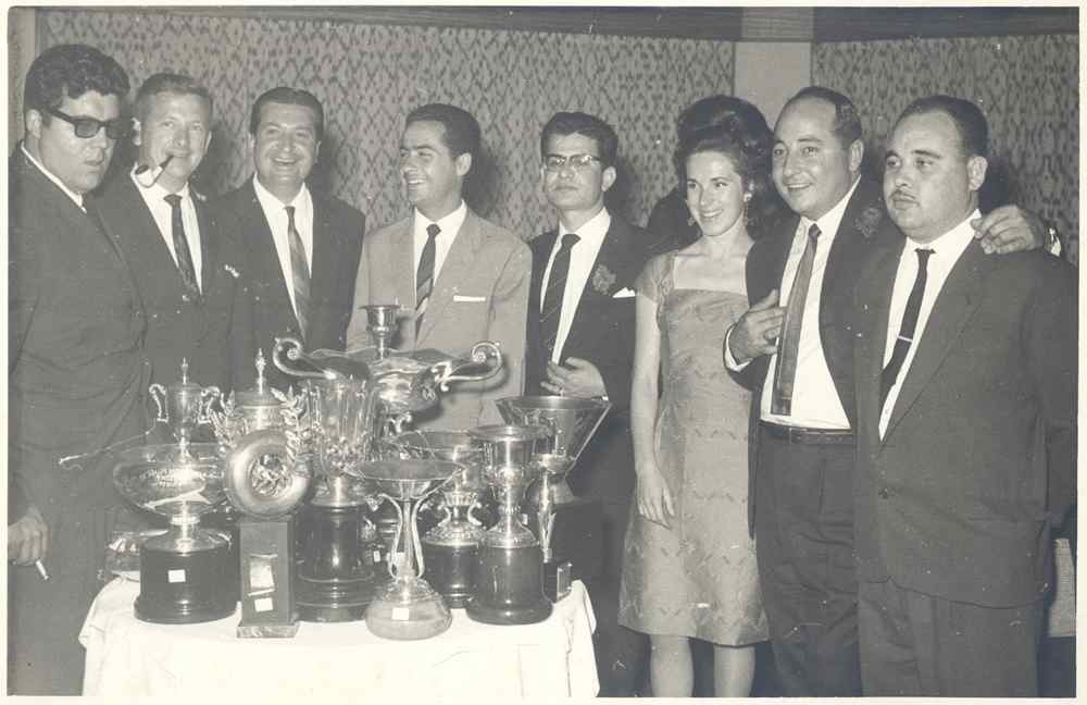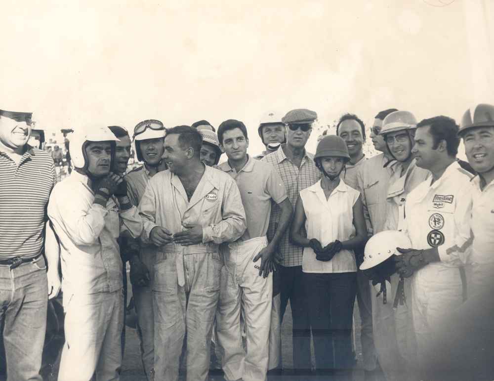 Gloria con los participantes de la categoría de Turismos en el 1er GP de Madrid en julio de 1967, durante las jornadas de inauguración del Jarama. © Gloria Castresana Waid