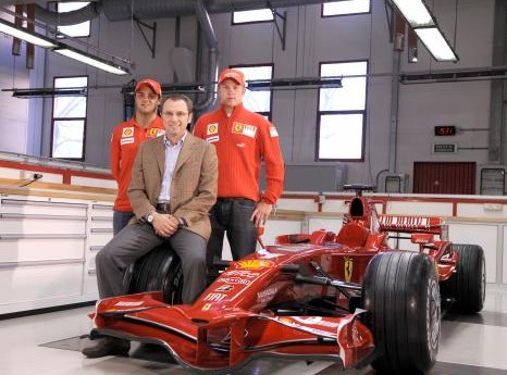 Los pilotos Kimi Raikkonen y Felipe Massa posan junto al jefe deportivo, Stefano Domenicali en Maranello. (EFE)