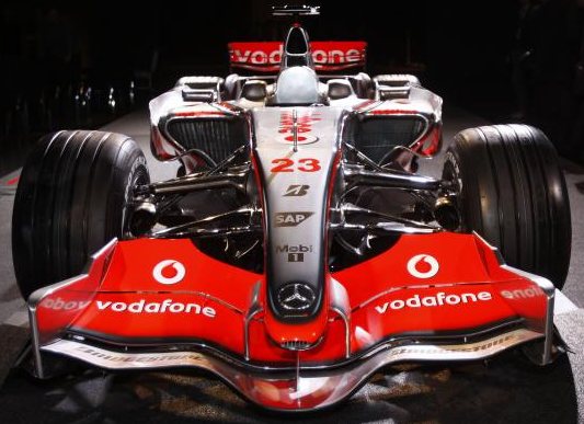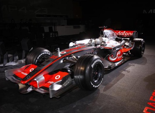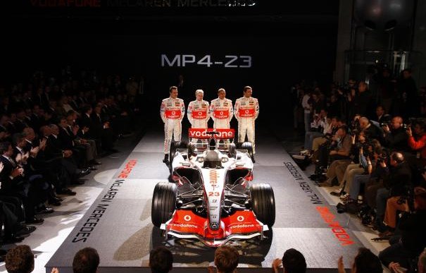 La escudería McLaren-Mercedes presentó en el Mercedes-Benz Museum de Stuttgart el nuevo MP4-23, el coche del equipo para el próximo Mundial de 2008, que mantiene una apariencia similar al anterior en color plateado y con el rojo de Vodafone. (Foto: www.mclaren.com)