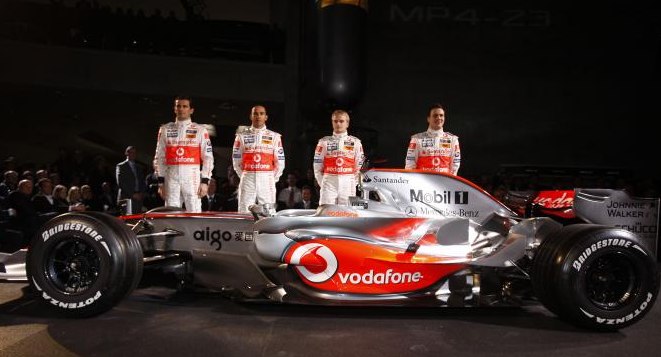 Pedro Martínez de la Rosa, Lewis Hamilton, Heikki Kovalainen y Gary Paffett posan detrás del nuevo MP4/23. (Foto: www.mclaren.com)