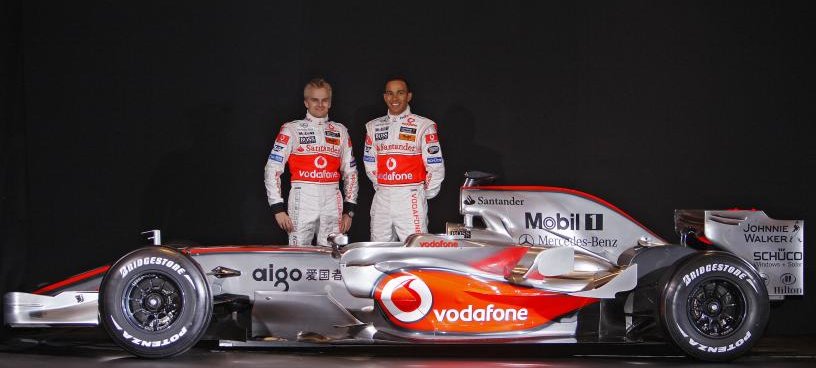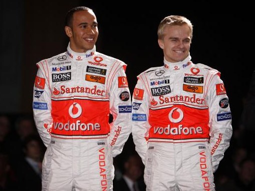 El piloto británico Lewis Hamilton y el finlandés Heikki Kovalainen durante la presentación del nuevo monoplaza de la escudería McLaren Mercedes, el MP4/23, coche con el que estos pilotos participarán en el Mundial de Fórmula Uno de 2008. (Foto: www.mclaren.com)