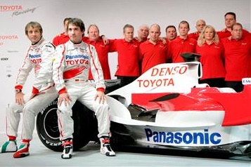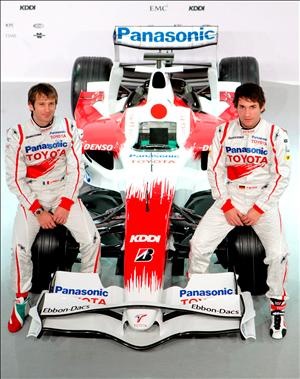 El piloto italiano Jarno Trulli y el alemán Timo Glock del equipo Panasonic Toyota, posan junto al nuevo monoplaza del equipo. (EFE)