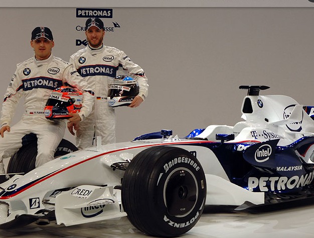El piloto polaco Robert Kubica y el alemán Nick Heidfeld (i) posan durante la presentación del nuevo coche de carreras BMW Sauber F1.08. (EFE)