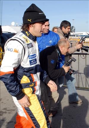 Fernando Alonso, que estrenó este lunes su R-28 sobre el circuito de la Comunidad Valenciana Ricardo Tormo, a su llegada a boxes. (EFE)