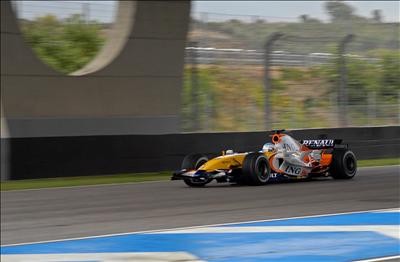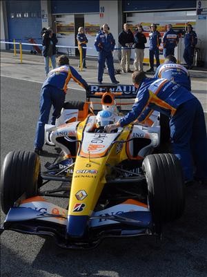 Fernando Alonso se introduce en el monoplaza R27 con reglajes 2008 en las pruebas de Jerez. (EFE)