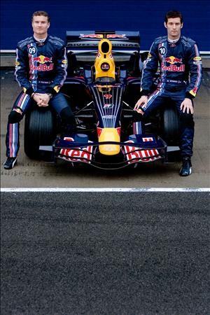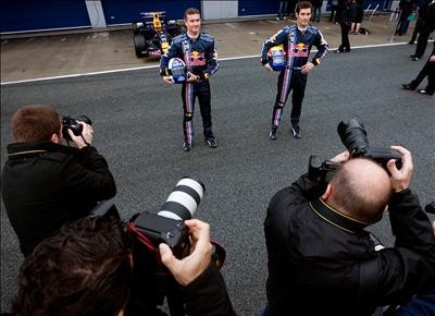 Los pilotos David Coulthard y el australiano Mark Webber posan para los fotografos durante la presentación del equipo Red Bull Racing. (EFE)