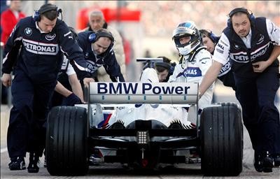 El coche del piloto alemán Nick Heidfeld (BMW Sauber) es empujado a boxes durante los entrenamientos de Cheste. (EFE)