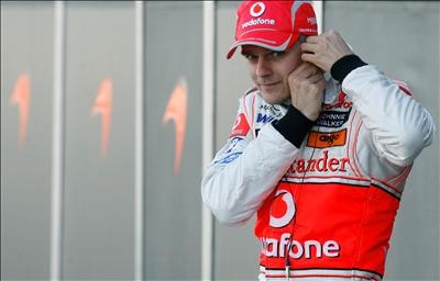El piloto finlandés Heikki Kovalainen (McLaren Mercedes) se prepara en los boxes para los entrenamientos que su escudería realiza en Cheste. (EFE)
