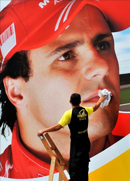 Un trabajador limpia un cartel gigante del piloto brasileño de Ferrari, Felipe Massa. (EFE)